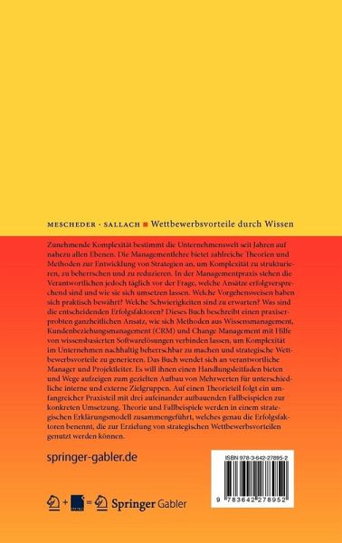 Dieses Buch beschreibt einen praxiserprobten ganzheitlichen Ansatz, wie sich Methoden aus Wissensmanagement, Kundenbeziehungsmanagement (CRM) und Change Management mit Hilfe von wissensbasierten Softwarelösungen verbinden lassen, um Komplexität im Unternehmen nachhaltig beherrschbar zu machen und strategische Wettbewerbsvorteile zu generieren. Das Buch wendet sich an verantwortliche Manager und Projektleiter. Es will ihnen einen Handlungsleitfaden bieten und Wege aufzeigen zum gezielten Aufbau von Mehrwerten für unterschiedliche interne und externe Zielgruppen. Auf einen Theorieteil folgt ein umfangreicher Praxisteil mit drei aufeinander aufbauenden Fallbeispielen zur konkreten Umsetzung. Theorie und Fallbeispiele werden in einem strategischen Erklärungsmodell zusammengeführt, welches genau die Erfolgsfaktoren benennt, die zur Erzielung von strategischen Wettbewerbsvorteilen genutzt werden können.