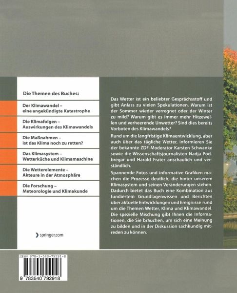 Das Wetter ist ein beliebter Gesprächsstoff und gibt Anlass zu vielen Spekulationen. Warum ist der Sommer wieder verregnet oder der Winter zu mild? Warum gibt es immer mehr Hitzewellen und verheerende Unwetter? Sind dies bereits Vorboten des Klimawandels? Rund um die langfristige Klimaentwicklung, aber auch über das tägliche Wetter, informieren Sie der bekannte ZDF-Moderator Karsten Schwanke sowie die Wissenschaftsjournalisten Nadja Podbregar und Harald Frater anschaulich und verständlich. Spannende Fotos und informative Grafiken machen die Prozesse deutlich, die hinter unserem Klimasystem und seinen Veränderungen stehen. Dadurch bietet das Buch eine Kombination aus fundiertem Grundlagenwissen und Berichten über aktuelle Entwicklungen und Ereignisse rund um die Themen Wetter, Klima und Klimawandel. Die spezielle Mischung gibt Ihnen die Informationen, die Sie brauchen, um sich eine Meinung zu bilden und in der Diskussion sachkundig mitreden zu können.