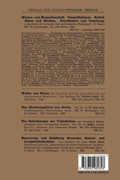 I. Deduktive und induktive Meteoropathologie.- II. Wettervorgänge und Krankheit (Meteorotrope Krankheiten).- 1. Allgemeines.- 2. Die Gruppenbildung.- 3. Die meteorischen Vorgänge zur Zeit der Gruppenbildung.- 4. Die einzelnen meteorotropen Krankheiten.- 5. Spezielle Fragen zum Zustandekommen der Krankheitsauslösung.- 6. Der Föhn.- III. Jahres?eit und Krankheit (Saisonkrankheiten).- 1. Der Sommergipfel.- 2. Der Winterfrühjahrsgipfel.- 3. Zur Pathogeographie des Saisongipfels.- Literatur.