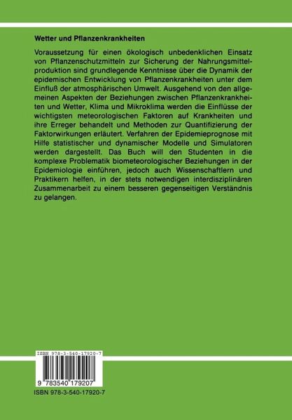 Ein gezielter Einsatz von Pflanzenschutzmitteln ist für die Sicherung der Nahrungsgrundlage der Bevölkerung unbedingt notwendig. Dazu ist eine vertiefte Kenntnis der Dynamik der Entwicklung von Pflanzenkrankheiten, insbesondere die Wirkung von atmosphärischen Umweltbelastungen auf Pflanzen, eine wesentliche Voraussetzung. Ausgehend von allgemeinen Aspekten der Beziehung zwischen Pflanzenkrankheiten und Wetter, Klima und Mikroklima, wird der Einfluß der wichtigsten meteoro- logischen Faktoren auf die Erreger- und Krankheitsentwicklung behandelt. Zugleich wird auf verschiedene Methoden zur Er- mittlung, Beurteilung und Quantifizierung der einwirkenden Faktoren eingegangen. Dieses Buch soll den Studenten in die komplexe Problematik dieser Beziehung einführen, doch gleichzeitig Wissenschaftlern und Praktikern helfen, bei dieser interdisziplinären Zusammenarbeit zu einem besseren gegenseitigen Verständnis zu gelangen.