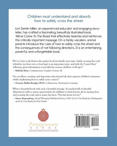 Children must understand and absorb how to safely cross the street. Lori Samlin Miller, an experienced educator and engaging storyteller, has crafted a fascinating, beautifully illustrated book, We've Come To The Road , that effectively teaches and reinforces this critically important message. On a family vacation, animal parents introduce the rules of how to safely cross the street and the consequences of not following directions. It is an entertaining, powerful, and unforgettable book. REVIEWS "We've Come to the Road is the perfect book for family story time. Safely crossing the road (whether you have two or four legs) is an important topic, and with the 'Learn More' followup, great information is provided for curious children of all ages!" -Melinda Kane, Commissioner, Camden County, NJ "An excellent, exciting, and important educational tale that captures children's attention while emphasizing how to safely cross a street!" -Suzanne Muller-Koegler, Ph.D. in Education, Teaching & Learning "What a beautiful book with such a heartfelt message. It's packed full of adorable illustrations with so many opportunities for children to learn lessons about staying close and crossing the road, and so many fun facts. This hits home for me!" -Stacey Kannenberg, Award Winning Publisher/Author, CEO of Let's Get Ready for Kindergarten and Let's Get Ready for First Grade!