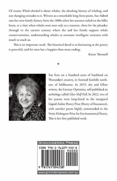 'Of course Whale-shocked is about whales, the shocking history of whaling, and our changing attitudes to it. Written as a remarkable long-form poem, Sue Aldred uses her own family history from the 1800s when her ancestor sailed on the killer boats, at a time when whales were seen only as a resource, there for the plunder, through to the current century where she and her family support whale conservationists, understanding whales as awesome intelligent creatures with much to teach us. This is an important work. The historical detail is as fascinating as the poetry is powerful, and for once has a happier-than-most ending.' - Karen Throssell