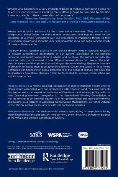 Philippa Brakes is a marine biologist, specialising in marine mammal welfare and the ethical issues associated with our interactions with cetaceans and their environments. She has served as an expert on cetacean welfare issues and whaling policy with the New Zealand Government delegation to the International Whaling Commission, as well as serving as an informal adviser to other Government and non-Government delegations; as a lecturer in Zoological Conservation Management; as Marine Advisor to the RSCPA; and as the Curator of a British Zoological Gardens. Mark Peter Simmonds is an environmental scientist specialising in the problems facing marine mammals in the 21st century. He is currently the International Director of Science at the Whale and Dolphin Conservation Society.