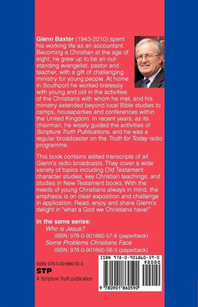 Glenn Baxter (1943-2010) spent his working life as an accountant. He became a Christian at the age of eight, and grew up to be an outstanding evangelist, pastor and teacher, with a special gift of challenging ministry for young people. At home in Southport he worked tirelessly with young and old in the activities of the Christians with whom he met, and his ministry extended beyond local Bible studies to camps, houseparties and conferences within the United Kingdom. In recent years, as its chairman, he wisely guided the activities of Scripture Truth Publications, and he was a regular broadcaster on the Truth for Today radio programme. This book contains edited transcripts of all Glenn's radio broadcasts. They cover a wide variety of topics including Old Testament character studies, key Christian teachings, and studies in New Testament books. With the needs of young Christians to the fore in each case, the emphasis is on clarity of exposition and challenge in application. Read, enjoy and share Glenn's delight in "what a God we Christians have!"