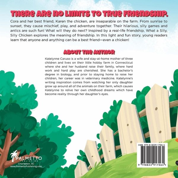 Cora and her best friend, Karen the chicken, are inseparable on the farm. From sunrise to sunset, Cora and Karen spend their days causing mischief, playing, and adventuring together. Their hilarious, silly games and antics are such fun! What will they do next? Inspired by the real-life friendship between author Katelynne Caruso's daughter and her pet chicken, What a Silly, Silly Chicken explores the meaning and joys of friendship. In this light and fun story, young readers learn that anyone and anything can be a best friend-even a chicken! Small children and their parents, pet owners, farm owners, farm hobbyists, and backyard chicken enthusiasts will love and enjoy this whimsical, humorous, and imaginative story.