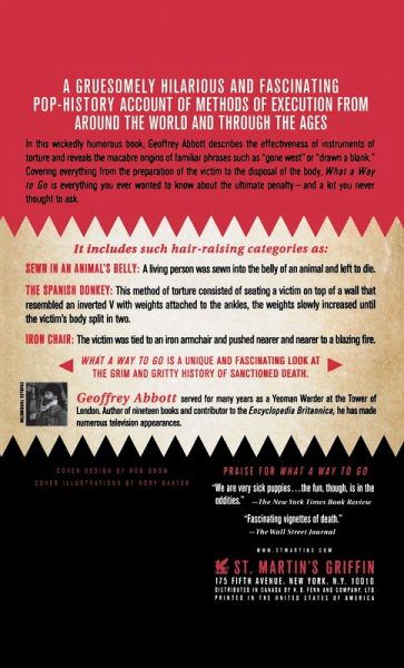 A gruesomely, hilarious and fascinating pop-history account of methods of execution from around the world and through the ages In this wickedly humorous book, Geoffrey Abbott describes the effectiveness of instruments of torture and reveals the macabre origins of familiar phrases such as 'gone west' or 'drawn a blank'. Covering everything from the preparation of the victim to the disposal of the body 'What a Way to Go' is everything you ever wanted to know about the ultimate penalty---and a lot you never thought to ask. It includes such hair-raising categories as: - Sewn in an Anima's Belly: A living person is sewn into the belly of an animal and left to die& - The Spanish Donkey: This method of torture consisted of seating a victim on top of a wall that resembled an inverted V with weights attached to the ankles, the weights slowly increased until the victim's body split in two - Iron Chair: The victim is tied to an iron armchair and pushed nearer and nearer to a blazing fire What a Way to Go is a a unique and fascinating look at the grim and gritty history of sanctioned death