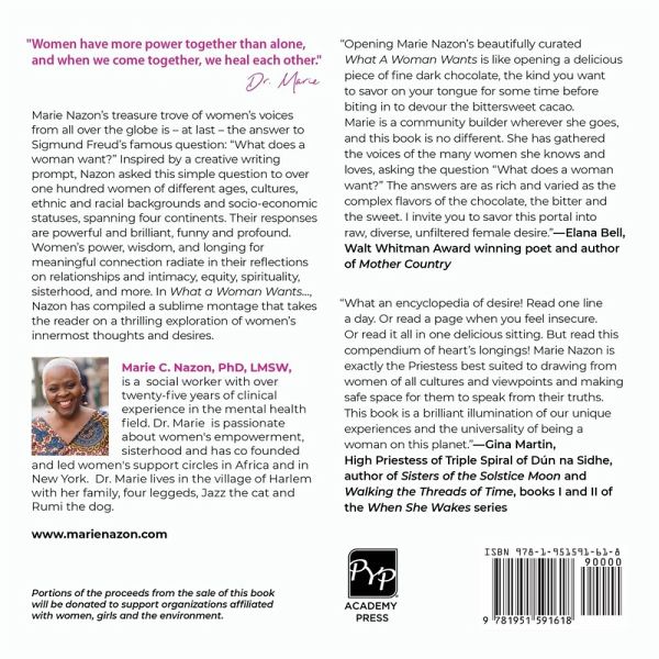 Marie Nazon's treasure trove of women's voices from all over the globe is - at last - the answer to Sigmund Freud's famous question: "What does a woman want?" Inspired by a creative writing prompt, Nazon asked this simple question to over one hundred women of different ages, cultures, ethnic and racial backgrounds and socio-economic status spanning four continents. Their responses are powerful and brilliant, funny and profound. Women's power, wisdom, and longing for meaningful connection radiate in their reflections on relationships and intimacy, equity, spirituality, sisterhood, and more. In "What a Women Want...," Nazon has compiled a sublime montage that takes the reader on a thrilling exploration of women's innermost thoughts and desires.