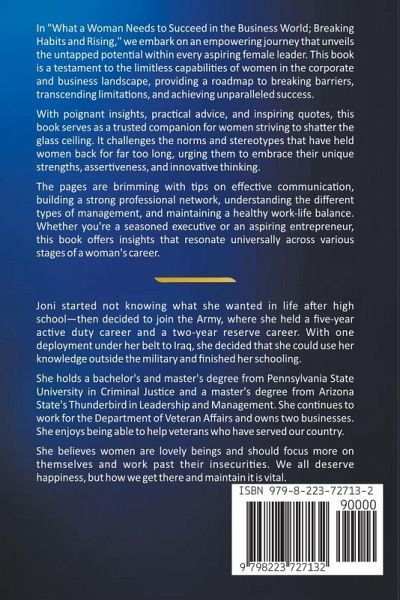 In "What a Woman Needs to Succeed in the Business World; Breaking Habits and Rising," we embark on an empowering journey that unveils the untapped potential within every aspiring female leader. This book is a testament to the limitless capabilities of women in the corporate and business landscape, providing a roadmap to breaking barriers, transcending limitations, and achieving unparalleled success. With poignant insights, practical advice, and inspiring quotes, this book serves as a trusted companion for women striving to shatter the glass ceiling. It challenges the norms and stereotypes that have held women back for far too long, urging them to embrace their unique strengths, assertiveness, and innovative thinking. The pages are brimming with tips on effective communication, building a strong professional network, understanding the different types of management, and maintaining a healthy work-life balance. Whether you're a seasoned executive or an aspiring entrepreneur, this book offers insights that resonate universally across various stages of a woman's career.