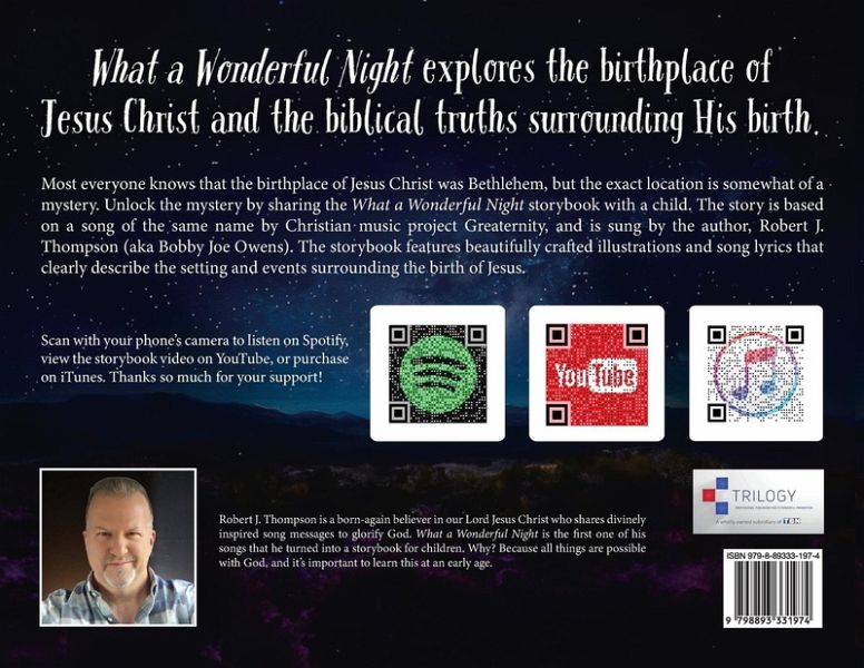 What a Wonderful Night explores the birthplace of Jesus Christ and the biblical truths surrounding His birth. Most everyone knows that the birthplace of Jesus Christ was Bethlehem, but the exact location is somewhat of a mystery. Unlock the mystery by sharing the What a Wonderful Night storybook with a child. The story is based on a song of the same name by Christian music project Greaternity, and is sung by the author, Robert J. Thompson (aka Bobby Joe Owens). The storybook features beautifully crafted illustrations and song lyrics that clearly describe the setting and events surrounding the birth of Jesus.