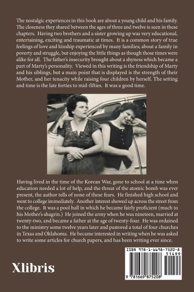 The nostalgic experiences in this book are about a young child and his family. The closeness they shared between the ages of three and twelve is seen in these chapters. Having two brothers and a sister growing up was very educational, entertaining, exciting and traumatic at times. It is a common story of true feelings of love and kinship experienced by many families; about a family in poverty and struggle, but enjoying the little things as though those times were alike for all. The father's insecurity brought about a shyness which became a part of Marty's personality. Viewed in this writing is the friendship of Marty and his siblings, but a main point that is displayed is the strength of their Mother, and her tenacity while raising four children by herself. The setting and time is the late forties to mid-fifties. It was a good time.