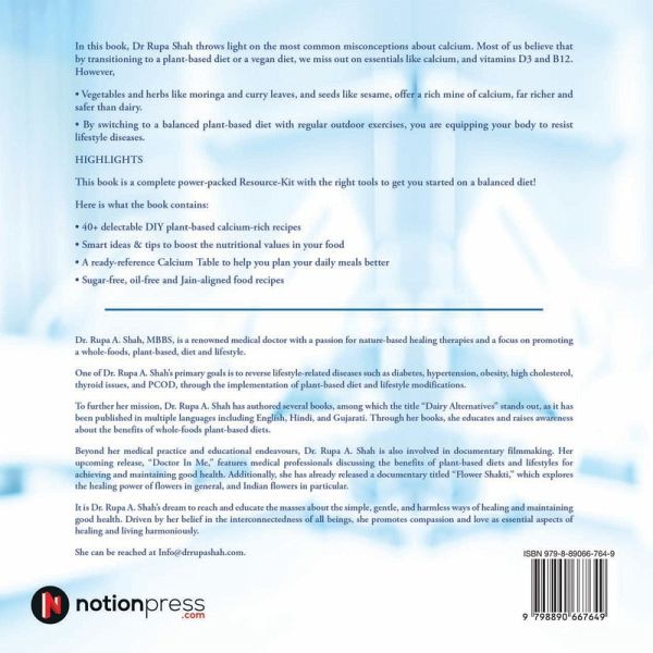In this book, Dr. Rupa Shah throws light on the most common misconceptions about calcium. Most of us believe that by transitioning to a plant-based diet or a vegan diet, we miss out on essentials like calcium, and vitamins D3 and B12. However, - Vegetables and herbs like moringa and curry leaves, and seeds like sesame, offer a rich mine of calcium, far richer and safer than dairy. - By switching to a balanced plant-based diet with regular outdoor exercises, you are equipping your body to resist lifestyle diseases. HIGHLIGHTS This book is a complete power-packed Resource-Kit with the right tools to get you started on a balanced diet! Here is what the book contains: - 40+ delectable DIY plant-based calcium-rich recipes - Smart ideas & tips to boost the nutritional values in your food - A ready-reference Calcium Table to help you plan your daily meals better - Sugar-free, oil-free and Jain-aligned food recipes