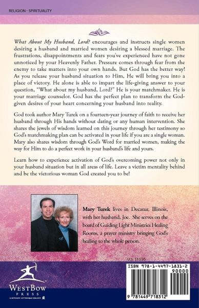 What About My Husband, Lord? encourages and instructs single women desiring a husband and married women desiring a blessed marriage. The frustrations, disappointments and fears you've experienced have not gone unnoticed by your Heavenly Father. Pressure comes through fear from the enemy to take matters into your own hands. But God has the better way! As you release your husband situation to Him, He will bring you into a place of victory. He alone is able to impart the life-giving answer to your question, "What about my husband, Lord?" He is your matchmaker. He is your marriage counselor. God has the perfect plan to transform the God-given desires of your heart concerning your husband into reality. God took author Mary Turek on a fourteen-year journey of faith to receive her husband through His hands without dating or any human intervention. She shares the jewels of wisdom learned on this journey through her testimony so God's matchmaking plan can be activated in your life if you are a single woman. Mary also shares wisdom through God's Word for married women, making the way for Him to do a perfect work in your husband's life and yours. Learn how to experience activation of God's overcoming power not only in your husband situation but in all areas of life. Leave a victim mentality behind and be the victorious woman God created you to be!