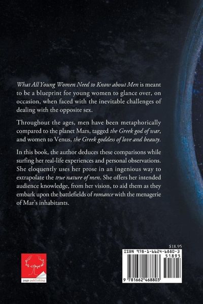 What Young Women Need to Know About Men is meant to be a blueprint for young women to glance over, on occasion, when faced with the inevitable challenges of dealing with the opposite sex. Throughout the ages, men have been metaphorically compared to the planet Mars, tagged the Greek god of war, and women to Venus, the Greek goddess of love and beauty. In this book, the author deduces these comparisons while surfing her real-life experiences and personal observations. She eloquently uses her prose in an ingenious way to extrapolate the true nature of men. She offers her intended audience knowledge, from her vision, to aid them as they embark upon the battlefields of romance with the menagerie of Mar's inhabitants.