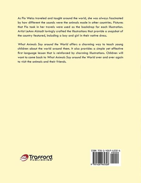 As Flo Weiss traveled and taught around the world, she was always fascinated by how different the sounds were the animals made in other countries. Pictures that Flo took in her travels were used as the backdrop for each illustration. Artist LeAnn Alstadt lovingly crafted the illustrations that provide a snapshot of the country featured, including a boy and girl in their native dress. What Animals Say around the World offers a charming way to teach young children about the world around them. It also provides a simple yet effective first language lesson that is reinforced by charming illustrations. Children will want to come back to What Animals Say around the World over and over again to visit the animals and their friends.