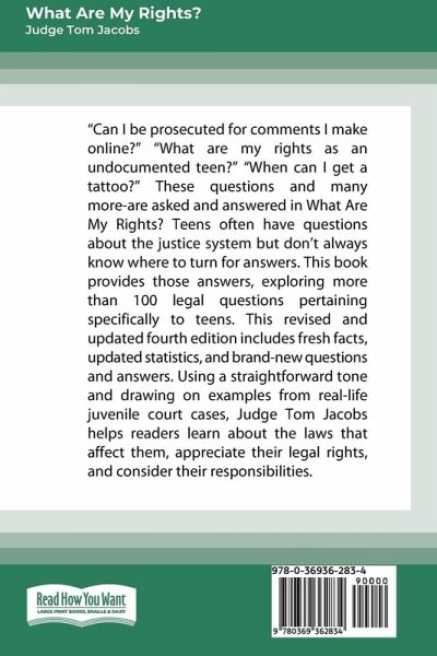 ''Can I be prosecuted for comments I make online?'' ''What are my rights as an undocumented teen?'' ''When can I get a tattoo?'' These questions-and many more-are asked and answered in What Are My Rights? Teens often have questions about the justice system but don't always know where to turn for answers. This book provides those answers, exploring more than 100 legal questions pertaining specifically to teens. This revised and updated fourth edition includes fresh facts, updated statistics, and brand-new questions and answers. Using a straightforward tone and drawing on examples from real-life juvenile court cases, Judge Tom Jacobs helps readers learn about the laws that affect them, appreciate their legal rights, and consider their responsibilities.