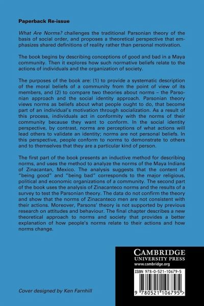 What are Norms? challenges the traditional Parsonian theory of the basis of social order and proposes a theoretical perspective that emphasises shared definitions of reality rather than personal motivation. The book begins by describing conceptions of good and bad in a Maya community. Then it explores how such normative beliefs relate to the actions of individuals and the organisation of society. Parsons' theory is not supported by previous research on attitudes and behaviour. The final chapter describes a new theoretical approach to norms and society that provides a better explanation of how people's norms relate to their actions and how norms change.