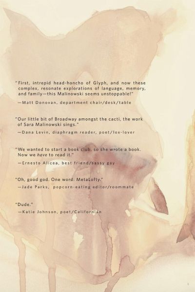 "First, intrepid head-honcho of Glyph, and now these complex, resonate explorations of language, memory, and family-this Malinowski seems unstoppable." -Matt Donovan, author of "Vellum" "Our little bit of Broadway amongst the cacti, the work of Sara Malinowski sings." -Dana Levin, author of "Sky Burial" "We wanted to start a book club, so she wrote a book. Now we have to read it." -Ernesto Alicea, best friend "Dude." -Katie Johnson, Californian, author of "Blood Jar"