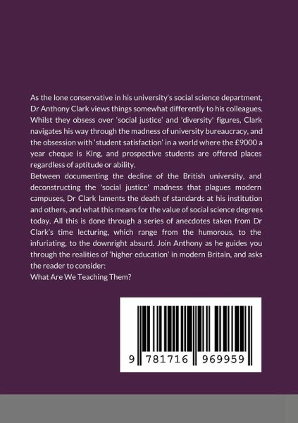 As the lone conservative in his university's social science department, Dr Anthony Clark views things somewhat differently to his colleagues. Whilst they obsess over 'social justice' and 'diversity' figures, Clark navigates his way through the madness of university bureaucracy, and the obsession with 'student satisfaction' in a world where the £9000 per year cheque is King, and prospective students are offered places regardless of aptitude or ability. Between documenting the decline of the British university, and deconstructing the 'social justice' madness that plagues modern campuses, Dr Clark laments the death of standards at his institution and others, and what this means for the value of social science degrees today. All this is done through a series of anecdotes taken from Dr Clark's time lecturing, which range from the humorous, to the infuriating, to the downright absurd. Join Anthony as he guides you through the realities of 'higher education' in modern Britain, and asks the reader to consider: What Are We Teaching Them?