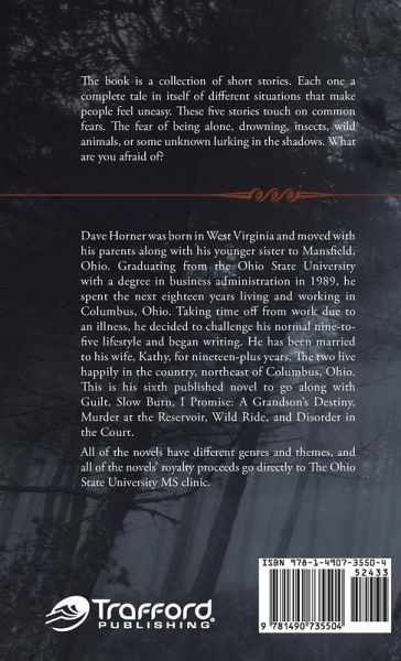 The book is a collection of short stories. Each one a complete tale in itself of different situations that make people feel uneasy. These five stories touch on common fears. The fear of being alone, drowning, insects, wild animals, or some unknown lurking in the shadows. What are you afraid of?