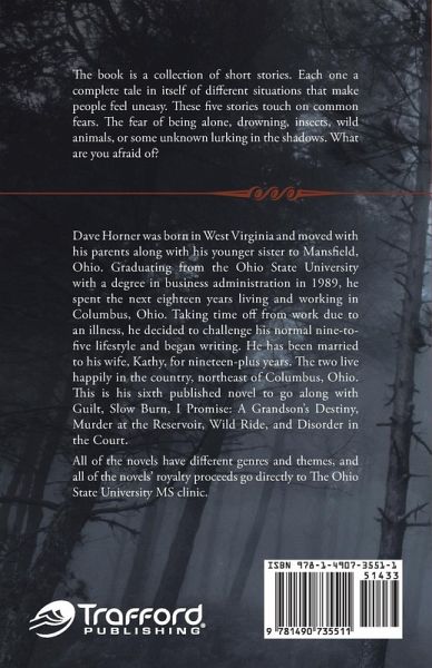 The book is a collection of short stories. Each one a complete tale in itself of different situations that make people feel uneasy. These five stories touch on common fears. The fear of being alone, drowning, insects, wild animals, or some unknown lurking in the shadows. What are you afraid of?