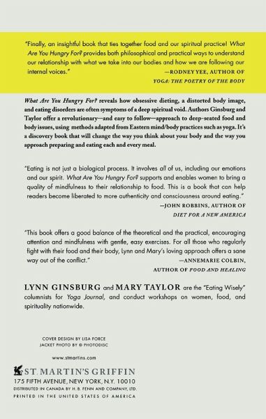 Women have many secrets. But a woman's secret relationship with food and her body can overshadow other aspects of her life, filling her with obsession, shame and fear. Many women waste countless years focusing on food and appearance, rather than spending energy on what holds deepest meaning for them in life. In What Are You Hungry For? authors Taylor and Ginsburg show how obsessive dieting, a distorted body image and eating disorders are often symptoms of a deep spiritual void. They offer a revolutionary--and easy to follow--approach to resolving deep-seated food and body issues using methods adapted from Eastern mind/body practices such as yoga. What Are You Hungry For? is a discovery book in the tradition of Susie Orbach's Fat is a Feminist Issue and Geneen Roth's When Food is Love. It will change the way you think about your body and the way you approach preparing and eating every single meal. "Finally, an insightful book that ties together food and our spiritual practice What Are You Hungry For? provides both philosophical and practical ways to understand our relationship with what we take into our bodies and to how we are following our internal voices." --Rodney Yee, yoga teacher and star of the bestselling video series "Yoga Journal's Yoga with Rodney Yee"