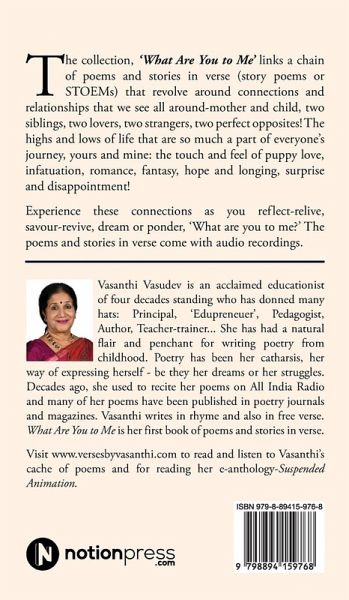 The collection, 'What Are You to Me' links a chain of poems and stories in verse (story poems or STOEMs) that revolve around connections and relationships that we see all around-mother and child, two siblings, two lovers, two strangers, two perfect opposites! The highs and lows of life that are so much a part of everyone's journey, yours and mine: the touch and feel of puppy love, infatuation, romance, fantasy, hope and longing, surprise and disappointment! Experience these connections as you reflect-relive, savour- revive, dream or ponder, 'What are you to me?' The poems and stories in verse come with audio recordings.