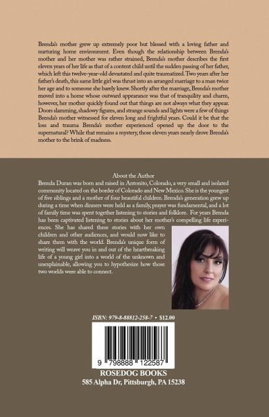 About the Book Brenda's mother grew up extremely poor but blessed with a loving father and nurturing home environment. Even though the relationship between Brenda's mother and her mother was rather strained, Brenda's mother describes the first eleven years of her life as that of a content child until the sudden passing of her father, which left this twelve-year-old devastated and quite traumatized. Two years after her father's death, this same little girl was thrust into an arranged marriage to a man twice her age and to someone she barely knew. Shortly after the marriage, Brenda's mother moved into a home whose outward appearance was that of tranquility and charm, however, her mother quickly found out that things are not always what they appear. Doors slamming, shadowy figures,and strange sounds and lights were a few of things Brenda's mother witnessed for eleven long and frightful years. Could it be that the loss and trauma Brenda's mother experienced opened up the door to the supernatural? While that remains a mystery, those eleven years nearly drove Brenda's mother to the brink of madness. About the Author Brenda Duran was born and raised in Antonito, Colorado, a very small and isolated community located on the border of Colorado and New Mexico. She is the youngest of five siblings and a mother of four beautiful children. Brenda's generation grew up during a time when dinners were held as a family, prayer was fundamental, and a lot of family time was spent together listening to stories and folklore. For years Brenda has been captivated listening to stories about her mother's compelling life experiences. She has shared these stories with her own children and other audiences, and would now like to share them with the world. Brenda's unique form of writing will weave you in and out of the heartbreaking life of a young girl into a world of the unknown and unexplainable, allowing you to hypothesize how those two worlds were able to connect.