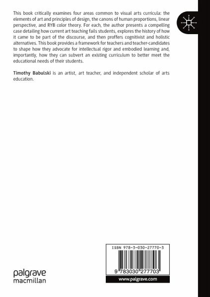 This book critically examines four areas common to visual arts curricula: the elements of art and principles of design, the canons of human proportions, linear perspective, and RYB color theory. For each, the author presents a compelling case detailing how current art teaching fails students, explores the history of how it came to be part of the discourse, and then proffers cognitivist and holistic alternatives. This book provides a framework for teachers and teacher-candidates to shape how they advocate for intellectual rigor and embodied learning and, importantly, how they can subvert an existing curriculum to better meet the educational needs of their students.
