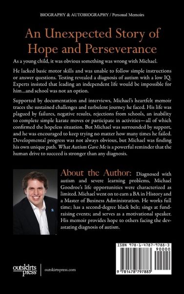 An Unexpected Story of Hope and Perseverance... As a young child, it was obvious something was wrong with Michael. He lacked basic motor skills and was unable to follow simple instructions or answer questions. Testing revealed a diagnosis of autism with a low IQ. Experts insisted that leading an independent life would be impossible for him...and school was not an option. Supported by documentation and interviews, Michael's heartfelt memoir traces the sustained challenges and turbulent journey he faced. His life was plagued by failures, negative results, rejections from schools, an inability to complete simple karate moves or participate in activities-all of which confirmed the hopeless situation. But Michael was surrounded by support, and he was encouraged to keep trying no matter how many times he failed. Developmental progress was not always obvious, but Michael was finding his own unique path. What Autism Gave Me is a powerful reminder that the human drive to succeed is stronger than any diagnosis.