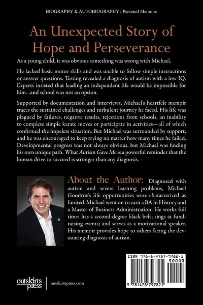 An Unexpected Story of Hope and Perseverance... As a young child, it was obvious something was wrong with Michael. He lacked basic motor skills and was unable to follow simple instructions or answer questions. Testing revealed a diagnosis of autism with a low IQ. Experts insisted that leading an independent life would be impossible for him...and school was not an option. Supported by documentation and interviews, Michael's heartfelt memoir traces the sustained challenges and turbulent journey he faced. His life was plagued by failures, negative results, rejections from schools, an inability to complete simple karate moves or participate in activities-all of which confirmed the hopeless situation. But Michael was surrounded by support, and he was encouraged to keep trying no matter how many times he failed. Developmental progress was not always obvious, but Michael was finding his own unique path. What Autism Gave Me is a powerful reminder that the human drive to succeed is stronger than any diagnosis.