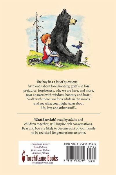 ¿2024 INDIES Book of the Year Awards finalist Shortlisted in the 2024 Little Peeps Awards for Early Readers and Children's Books The boy has a lot of questions-hard ones about love, honesty, grief and loss, prejudice, forgiveness, why we are here, and more. Bear's wise answers are always offered with compassion and enthusiasm. The friendship between these two is deep, tender, and sometimes fun. Bear's clear, common-sense philosophy of life is a welcome contrast to the complex world our children face today. On the beautifully illustrated pages, you will also meet Jay, Raccoon, Badger, Elder Moose, and others who add to the fun and adventure. Walk with Boy and Bear for a while in the woods and see what you might learn about life, love and other stuff. This uplifting book will surely become a treasured collection of simple wisdom, inspiring rich, meaningful conversations between adults and children alike. "Its modern take on mindful thinking, understanding others, and coping with many of life's more puzzling dilemmas [is] perfect for book clubs as well as group and parental pursuit." -D. Donovan, Midwest Book Review