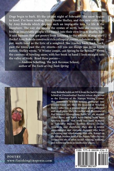 Amy Bobeda holds an MFA from the Jack Kerouac School of Disembodied Poetics at Naropa University and serves as the director of the writing center and sometimes teaches process-based art, writing, and pedagogy. Books include Red Memory (FlowerSong Press), What Bird Are You? (Finishing Line Press), and the chapbook Mi Sin Manitos (Ethel Press). Amy's work can be found in Ecotheo Review, Pithead Chapel, Denver Quarterly, Columbia Review, and elsewhere. Amy is the founder and publisher of Wisdom Body Collective, a process-based arts group rooted in somatic work and lineage as well as a member of the Society for Menstrual Cycle Research. Raised on the Amah Mutsun land of the Pajaro Valley, Amy is often found running in landlocked places.