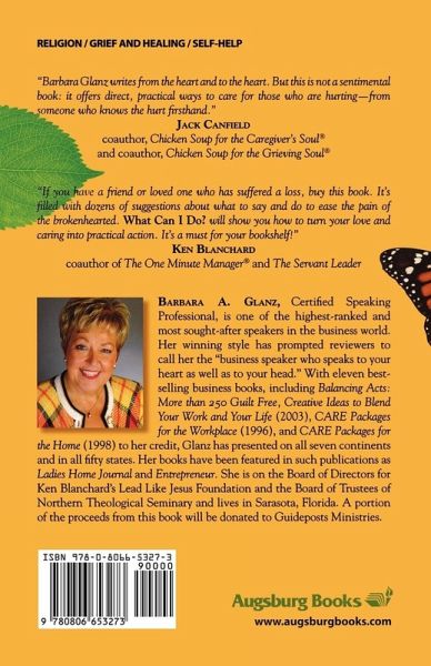 Barbara A. Glanz knows grief from personal experience. Her sondied at a very young age and her husband of many years diedrecently. Although the ideas in the book come primarily frompeople who have lost a loved one, most of the ideas are applicable toany kind of loss: the loss of a job, a divorce, the loss of arelationship, the loss of a pet, the loss of health, a move, or desertion. Written for the person who wants to help the one who is grieving, this book is filled with immediately practical ideas as well aslong term, specific ways to help someone move from grieving togrowth, and eventually to cherishing good memories.