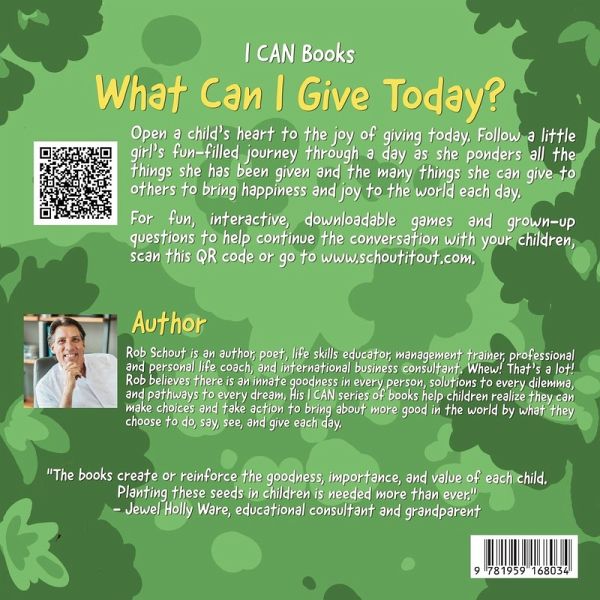 Open a child's heart to the joy of giving today. Follow a girl's fun-filled journey through a day as she ponders all the things she has been given and the many things she can give to others to bring happiness and joy to the world each day. Discover the entire I CAN series and download interactive games and grown-up questions to help continue the conversation with your children - www.schoutitout.com