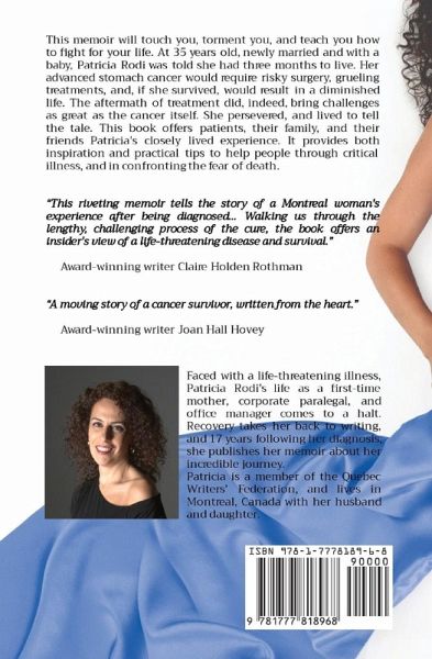 This memoir will touch you, torment you, and teach you how to fight for your life. At 35 years old, newly married and with a baby, Patricia Rodi was told she had three months to live. Her advanced stomach cancer would require risky surgery, grueling treatments, and, if she survived, would result in a diminished life. The aftermath of treatment did, indeed, bring challenges as great as the cancer itself. She persevered, and lived to tell the tale. This book offers patients, their family, and their friends Patricia's closely lived experience. It provides both inspiration and practical tips to help people through critical illness, and in confronting the fear of death. "This riveting memoir tells the story of a Montreal woman's experience after being diagnosed... Walking us through the lengthy, challenging process of the cure, the book offers an insider's view of a life-threatening disease and survival." Award-winning writer Claire Holden Rothman "A moving story of a cancer survivor, written from the heart." Award-winning writer Joan Hall Hovey