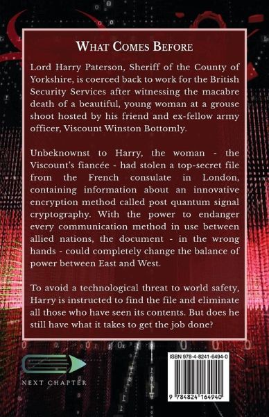 Lord Harry Paterson, Sheriff of the County of Yorkshire, is coerced back to work for the British Security Services after witnessing the macabre death of a beautiful, young woman at a grouse shoot hosted by his friend and ex-fellow army officer, Viscount Winston Bottomly. Unbeknownst to Harry, the woman - the Viscount's fiancée - had stolen a top-secret file from the French consulate in London, containing information about an innovative encryption method called post quantum signal cryptography. With the power to endanger every communication method in use between allied nations, the document - in the wrong hands - could completely change the balance of power between East and West. To avoid a technological threat to world safety, Harry is instructed to find the file and eliminate all those who have seen its contents. But does he still have what it takes to get the job done?