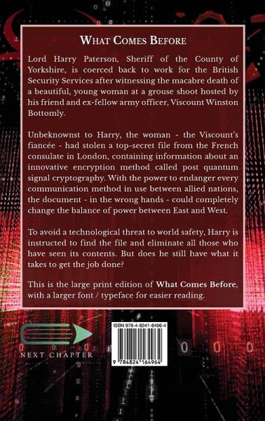 Lord Harry Paterson, Sheriff of the County of Yorkshire, is coerced back to work for the British Security Services after witnessing the macabre death of a beautiful, young woman at a grouse shoot hosted by his friend and ex-fellow army officer, Viscount Winston Bottomly. Unbeknownst to Harry, the woman - the Viscount's fiancée - had stolen a top-secret file from the French consulate in London, containing information about an innovative encryption method called post quantum signal cryptography. With the power to endanger every communication method in use between allied nations, the document - in the wrong hands - could completely change the balance of power between East and West. To avoid a technological threat to world safety, Harry is instructed to find the file and eliminate all those who have seen its contents. But does he still have what it takes to get the job done? This is the large print edition of What Comes Before, with a larger font / typeface for easier reading.