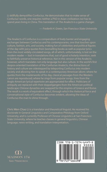 The Analects of Confucius is a compendium of lively banter and engaging exchanges between Confucius and his contemporaries, one that touches upon culture, fashion, arts, and society, making fun of celebrities and political figures of the day with juicy quotes from bestselling books as well as popular lyrics from the most widely-circulated songs, all of which, unfortunately, is lost on the modern reader - lost in translations that, out of good scholarly intention, seek to faithfully preserve historical reference. Not in this version of the Analects however, which translates not only language but also culture. In the world's first skopos-oriented translation of the Confucian Analects, the distractions of history and culture are sidestepped by teleporting Confucius into modern society and allowing him to speak in a contemporary American idiom: where he quotes from the masterworks of his day, classical passages from the Western canon are reproduced; where he sings from popular songs, lines from the Anglo-American lyrical repertoire are appropriated for effect. Politicians of antiquity are replaced with their doppelgangers from the American political landscape; Chinese dynasties are swapped for the empires of Greece and Rome. The result is a work of equivalent effect, through which the rhetorical force and conversational style of Confucius becomes evident, allowing the ideas of Confucius the man to shine through.