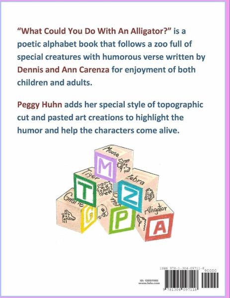"What Could You Do with an Alligator?" is a poetic alphabet book that follows a zoo full of special creatures with humorous verse written for the enjoyment of both children and adults. EXAMPLE: What could you do with an alligator? Put him in an elevator. Push all the buttons square or round and send that gator up and down. The illustrator adds her special style of full color topographic cut and paste are creations to highlight the humor and help the characters come alive. What the authors did with these find creatures was turn them into special features. They dared not do it medically, but simply alphabetically!