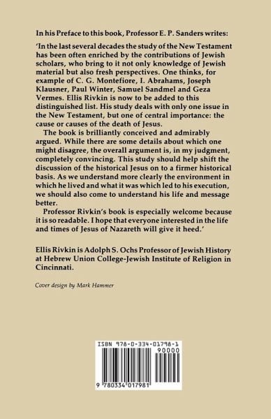 n his Preface to this book, Professor E. P. Sanders writes: 'In the last several decades the study of the New Testament has been often enriched by the contributions of Jewish scholars, who bring to it not only knowledge of Jewish material but also fresh perspectives. One thinks, for example of C. G. Montefiore, I. Abrahams, Joseph l(lausner, Paul Winter, Samuel Sandmel and Geza Vermes. Ellis Rivkin is now to be added to this distinguished list. His study deals with only one issue in the New Testament, but one of central importance: the cause or causes of the death of Jesus. The book is brilliantly conceived and admirably argued. While there are some details about which one might disagree, the overall argument is, in my judgment completely convincing. This study should help shift the discussion of the historical Jesus on to a firmer historical basis. As we understand more clearly the environment'in which he lived and what it was which led to his execution, we should also come to understand his life and message better. Professor Rivkin's book is especially welcome because it is so readable. I hope that everyone interested in the life and times of Jesus of Nazareth will give it heed.'