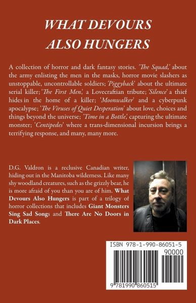 Horror stories by D.G. Valdron, author of 'The Mermaid's Tale,' 'Giant Monsters Sing Sad Songs' and 'There Are No Doors in Dark Places.' 'The Squad,' about the army enlisting the men in the masks, horror movie slashers as unstoppable, uncontrollable soldiers; 'Piggyback' about the ultimate serial killer; 'The First Men,' a Lovecraftian tribute; 'Silence' about a thief hiding in the home of a killer; 'Moonwalker' and a cyberpunk apocalypse; 'The Viruses of Quiet Desperation' about love, choices and things beyond the universe; 'Time in a Bottle,' a nondescript physics lab has captured the ultimate monster; 'Secrets' where a man accidentally receives a magazine for serial killers; 'Centipedes' where a trans-dimensional incursion brings a terrifying response, and many, many more. Melancholy horror, chilling horror, dark visions