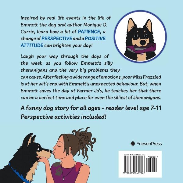 Inspired by real life events in the life of Emmett the dog and author Monique D. Currie, learn how a bit of PATIENCE, a change of PERSPECTIVE and a POSITIVE ATTITUDE can brighten your day! Laugh your way through the days of the week as you follow Emmett's silly shenanigans and the very big problems they can cause. After feeling a wide range of emotions, poor Miss Frazzled is at her wit's end with Emmett's unexpected behaviour. But, when Emmett saves the day at Farmer Jo's, he teaches her that there can be a perfect time and place for even the silliest of shenanigans. A funny dog story for all ages - reader level age 7-11 Perspective activities included!