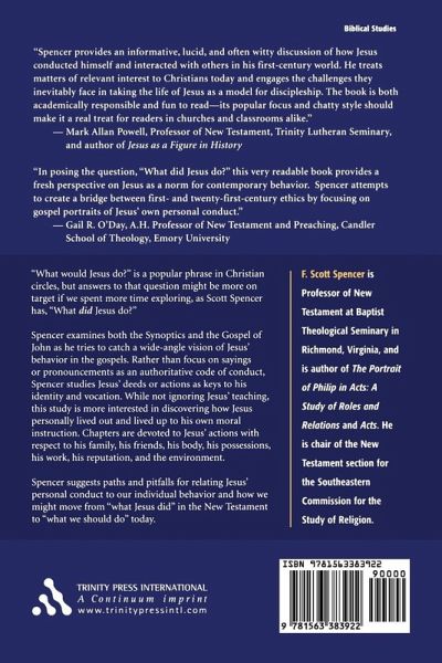 "What Would Jesus Do?" is a popular phrase in Christian circles, but answers to that question might be more on-target if we spent more time exploring, as Scott Spencer has, "What Did Jesus Do?" Spencer examines both the Synoptics and the Gospel of John as he tries to catch a wide-angled vision of Jesus' behavior in the gospels. Rather than focus on sayings or pronouncements as an authoritative code of conduct, he studies Jesus' deeds or actions as keys to his identity and vocation. While not ignoring Jesus' teaching, this study is more interested in discovering how Jesus personally lived up to his own moral instruction--his personal conduct. Chapters are devoted to Jesus' actions with respect to his family, his friends, his body, his possessions, his work, his reputation, and the environment.