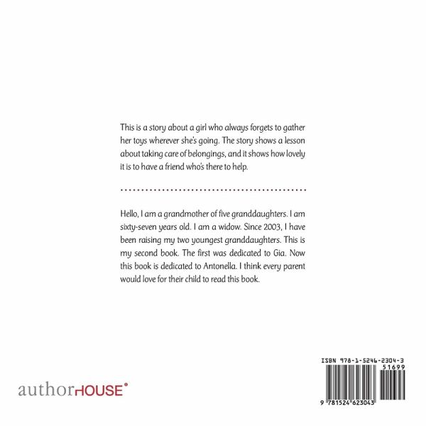 This is a story about a girl who always forgets to gather her toys wherever she's going. The story shows a lesson about taking care of belongings, and it shows how lovely it is to have a friend who's there to help.
