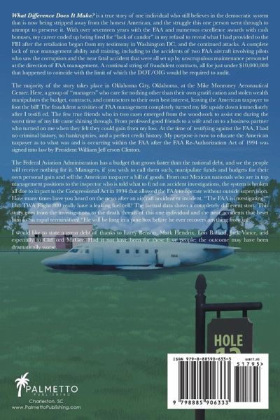 What Difference Does It Make? is a true story of one individual who still believes in the democratic system that is now being stripped away from the honest American, and the struggle this one person went through to attempt to preserve it. With over seventeen years with the FAA and numerous excellence awards with cash bonuses, my career ended up being fired for "lack of candor" in my refusal to reveal what I had provided to the FBI after the retaliation began from my testimony in Washington DC, and the continued attacks. A complete lack of true management ability and training, including to the accidents of two FAA aircraft involving pilots who saw the corruption and the near fatal accident that were all set up by unscrupulous maintenance personnel at the direction of FAA management. A continual string of fraudulent contracts, all for just under $10,000,000 that happened to coincide with the limit of which the DOT/OIG would be required to audit. The majority of the story takes place in Oklahoma City, Oklahoma, at the Mike Monroney Aeronautical Center. Here, a group of "managers" who care for nothing other than their own gratifi cation and stolen wealth manipulates the budget, contracts, and contractors to their own best interest, leaving the American taxpayer to foot the bill! The fraudulent activities of FAA management completely turned my life upside down immediately after I testified. The few true friends who in two cases emerged from the woodwork to assist me during the worst time of my life came shining through. From professed good friends to a wife and on to a business partner who turned on me when they felt they could gain from my loss. At the time of testifying against the FAA, I had no criminal history, no bankruptcies, and a perfect credit history. My purpose is now to educate the American taxpayer as to what was and is occurring within the FAA after the FAA Re-Authorization Act of 1994 was signed into law by President William Jefferson Clinton. The Federal Aviation Administration has a budget that grows faster than the national debt, and we the people will receive nothing for it. Managers, if you wish to call them such, manipulate funds and budgets for their own personal gain and sell the American taxpayer a bill of goods. From our Mexican nationals who are in top management positions to the inspector who is told what to find on accident investigations, the system is broken all due to in part to the Congressional Act in 1994 that allowed the FAA to operate without outside supervision. How many times have you heard on the news after an aircraft accident or incident, "The FAA is investigating?" Did TWA Flight 800 really have a leaking fuel cell? The factual data shows a completely different story. This story goes from the investigations to the death threats of this one individual and the near accidents that beset him to his rapid termination! "He will be long in a pine box before he ever recovers anything from us!" I would like to state a great debt of thanks to Larry Benson, Mark Hendrix, Lois Ballard, Jack Vance, and especially to Clifford MaGee. Had it not have been for these five people; the outcome may have been dramatically worse.