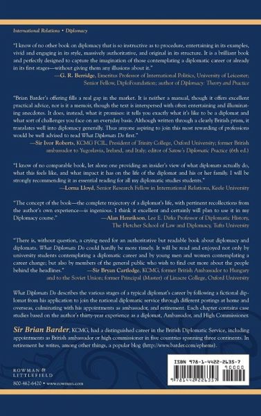 Foreword by Sir Ivor Roberts Chapter 1: Introduction Chapter 2: The Candidate for a Diplomatic Career Chapter 3: Arrival at a New Post Chapter 4: Life in the Embassy Chapter 5: Life Overseas Chapter 6: Multilateral Diplomacy Chapter 7: Diplomacy in a Hostile Country Chapter 8: Dealing with Foreigners Chapter 9: Dealing with the Foreign Ministry from Abroad Chapter 10: Entertaining and Being Entertained Chapter 11: Serving in the FCO at Home Chapter 12: A Dog's Life for the Spouse and the Kids? Chapter 13: Consular and Commercial Activities Chapter 14: Looking Back: Reflections on the Diplomatic Career