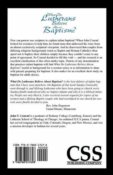 How can pastors explain infant baptism using scripture? When John Conrad looked for resources to help him, he found none that addressed the issue from an almost exclusively scriptural viewpoint. And he discovered that couples from differing religious backgrounds (such as Baptist and Roman Catholic) often opted not to baptize their children mainly because they couldn't come to any point of agreement. So Conrad decided to fill this void -- and his research is an excellent clarification of this often murky topic. What Do Lutherans Believe About Baptism? will be useful to pastors as background for a sermon series or as information to share with parents preparing for baptism. It also makes for an excellent short study on baptism for adult classes. What Do Lutherans Believe About Baptism? is the best defense of infant baptism that I have seen anywhere. On Baptism of Our Lord Sunday I basically went through it, and lifelong Lutherans who have been going to church every Sunday finally understood why we baptize infants and why it is a biblical ministry. People not only liked it, I also received several requests for copies of my sermon and a lifelong Baptist couple who had worshiped in our church for several years finally decided to join. Rev. John Hogenson Grand Marais, Minnesota