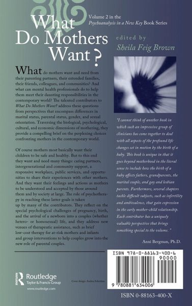 Brown Introduction. Part I: What Mothers Want and Need.Stern The Psychic Landscape of Mothers. Balsam Loving and Hating Mothers and Daughters: Thoughts on the Role of Their Physicality. Benjamin What Mothers and Babies Need: The Maternal Third and Its Presence in Clinical Work. Herzog What Fathers Do and How They Do It. Ruddick What Do Mothers and Grandmothers Know and Want? Drescher Glazer Crespi & Schwartz What Is a Mother? Gay and Lesbian Perspectives on Parenting. Schwartz It's A(p)Parent: New Family Narratives Needed. Gensler Safran What Does a Mother Want and Need from Her Child's Therapist? Part II: Women's Bodies: Choices and Dilemmas.Chodorow "Too Late": Ambivalence about Motherhood Choice and Time. Kofman Imber Pregnancy. Rosen Facts and Fantasies about Infertility. Petrucelli Stuart Layers upon Layers: The Complicated Terrain of Eating Disorders and the Mother-Child Relationship. Part III: Pulling It All Together.Lazarre Listen to My Words: Maternal Life in Colors and Cycles of Time. Cowan Cowan To Be Partners and Parents: The Challenge for Couples Who Are Parents.
