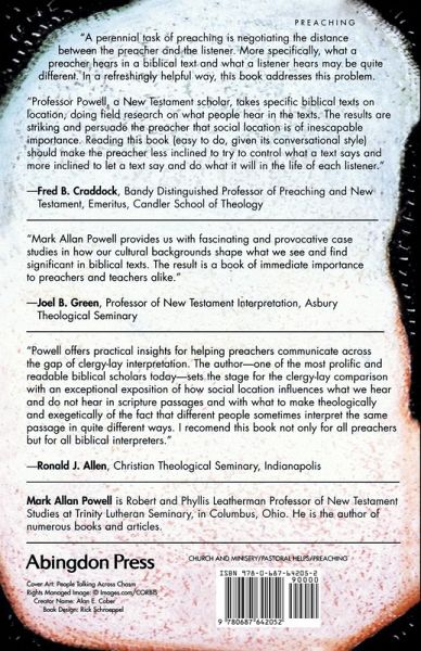 PREACHINGPowell provides a startling study of how differently the pastor and the congregation interpret Scripture, how this difference affects what the congregation hears in the sermon, and how to bridge this gap with equally startling practical steps. This remarkably fascinating book reveals how significant social location--such as age, gender, nationality, race, and education--is when interpreting the Bible. Illustrated with two studies, Mark Allan Powell demonstrates how this plays out most dramatically in the gulf, often quite wide, between the preacher and the congregation.Every preacher who reads this book will appreciate as never before the significance of social differences in the reception of his or her sermon, will see the unmistakable need to bridge this gap, and will receive clear instruction on how to do just that.