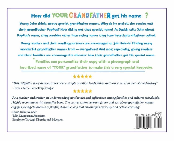 Young John thinks about special grandfather names. Why do he and all the cousins call their grandfather PopPop? How did he get that special name? As Daddy tells John about PopPop's name, they consider other interesting names they have heard grandfathers called. Young readers and their reading partners are encouraged to join John in finding many wonderful grandfather names from - everywhere! And most especially, young readers and their families are encouraged to discover how their grandfather got his special name. *Families can personalize their copy with a photograph and inscribed name of "YOUR" grandfather to make this a very special keepsake.